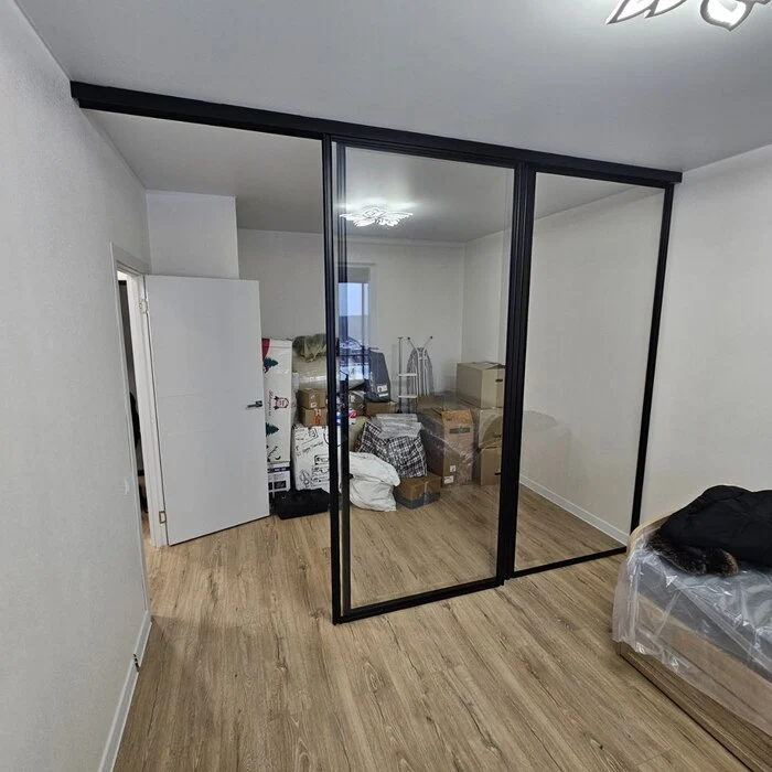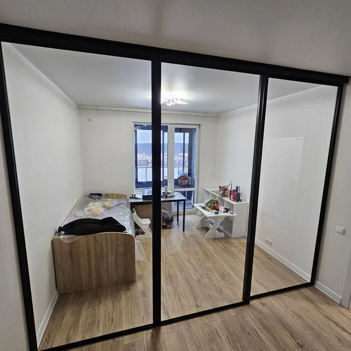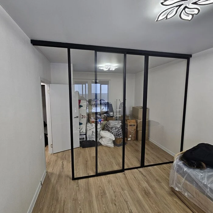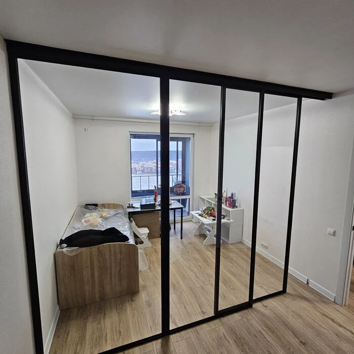Установили перегородку в однокомнатной квартире с готовым натяжным потолком. Подвесная система без нижней направляющей. Перегородка отделяет детскую зону, поэтому использовали закаленное стекло 6мм для максимальной безопасности. Установлен карниз для штор. Заказчики довольны!
